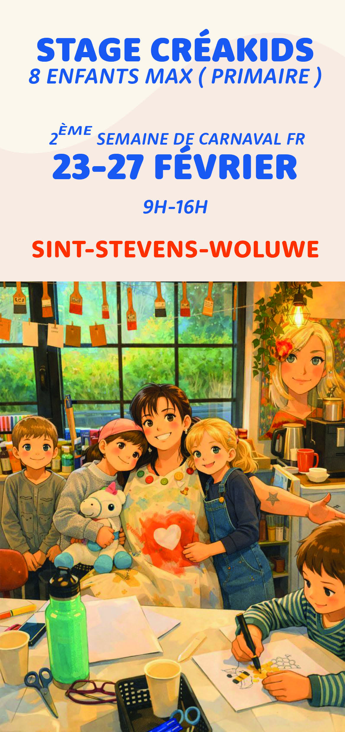 - Durée : 5 jours complets, de 9h00 à 16h00 – possibilité de garderie dès 8h30 jusque 16h30.